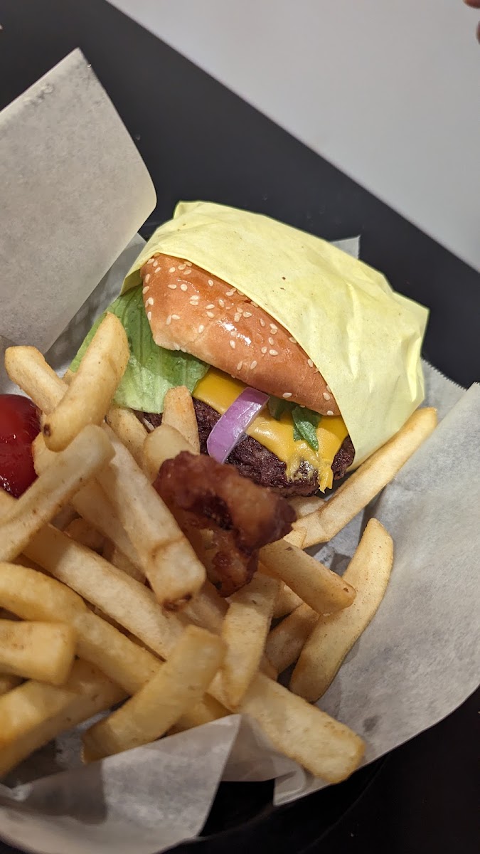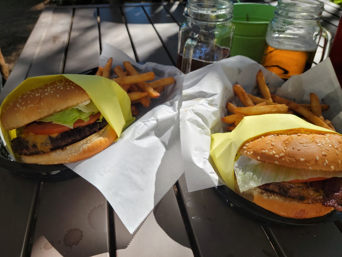 This trip in we had a bacon cheeseburger and classic cheese burger with fries. A Hexaginia and 805 draft beers. We sat outside amidst the beautiful trees and foliage. Everything was SO GOOD!! We LOVE this place!! And the staff!! They do have EXCELLENT PIZZA!!