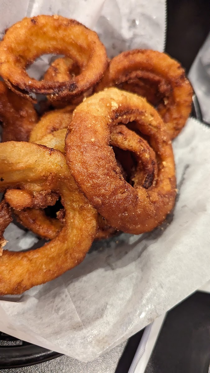 Pizza, burgers, fried shrimp and fish& chips. Good fries. Excellent onion rings. Forgot to change the kind of cheese on my sandwich unfortunately. Noisy when lots of people are there but not terrible. Bar room attached with pool table and several TVs and high-top tables.
