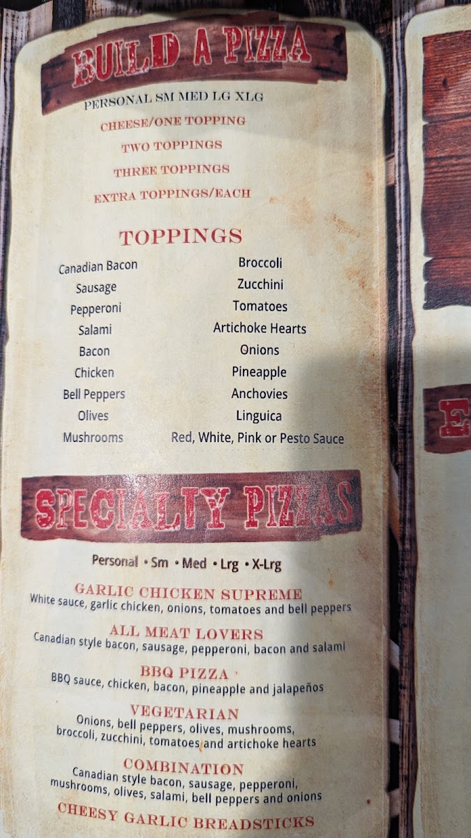 Pioneer Hillside Pizza Menu